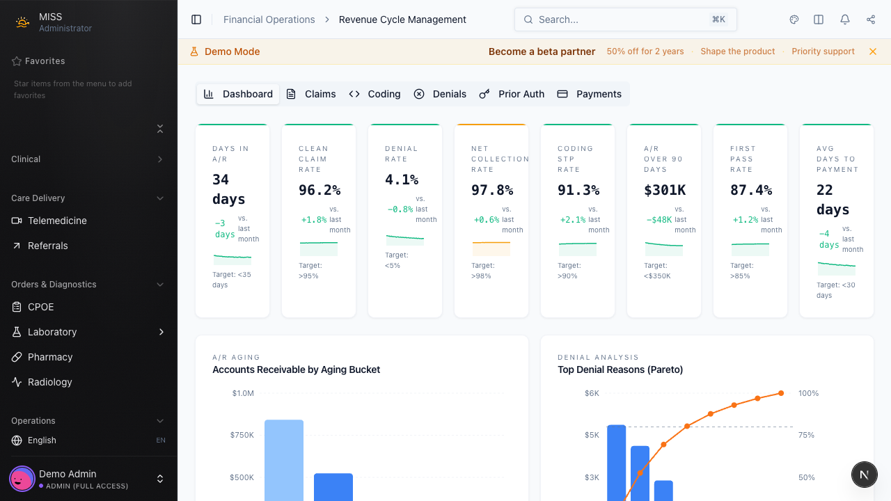 The system automatically finds "forgotten" services and billing errors. Clinics recover 5-15% of lost revenue.